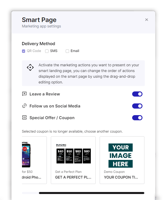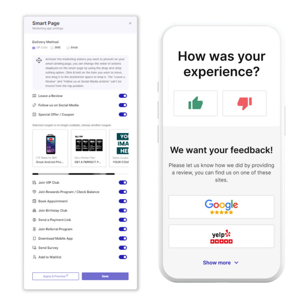 Smart Page gives your customers links to all of your marketing actions on one page, so they can choose from a variety of options to connect, claim an offer, review, refer, & follow.